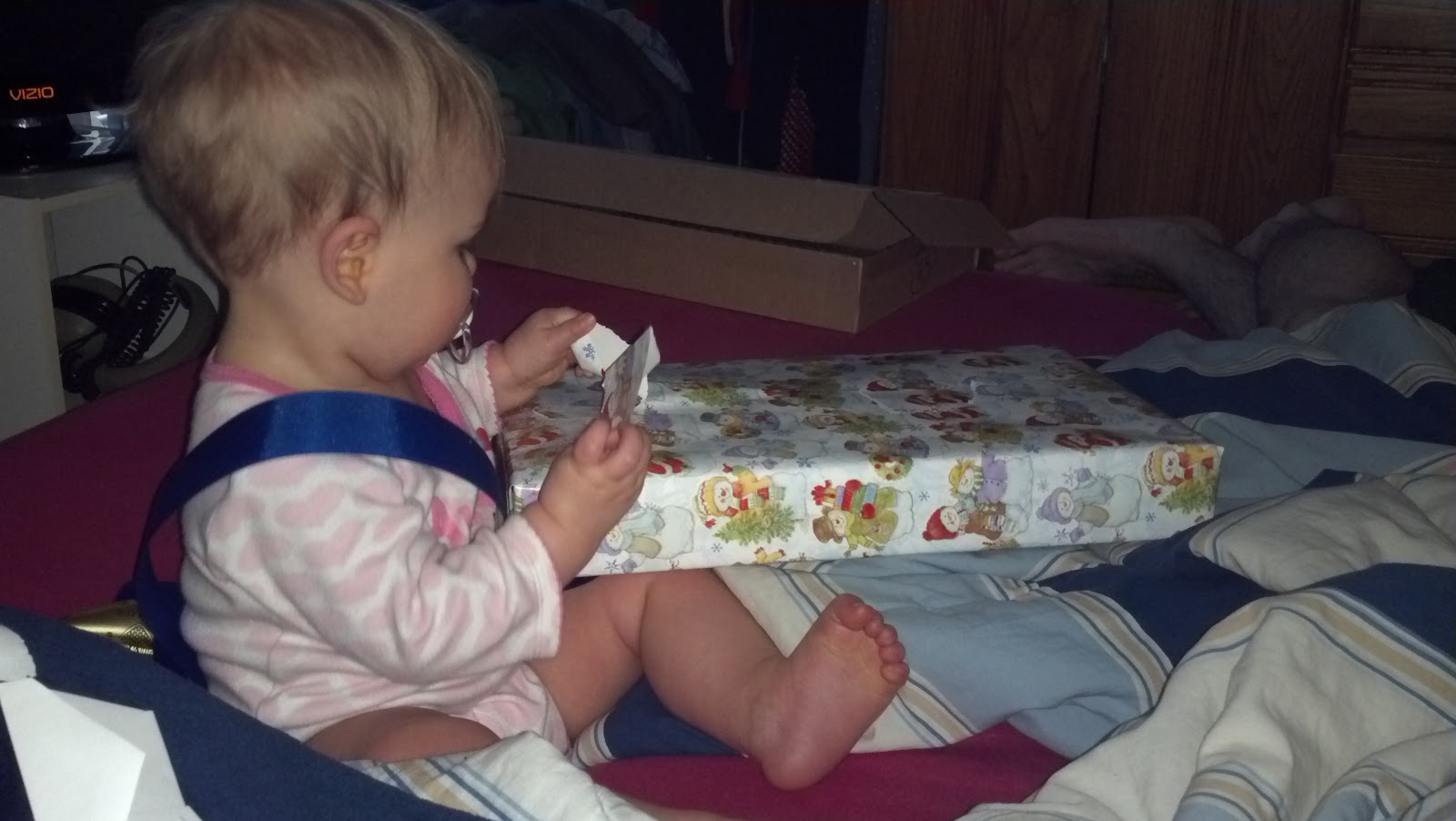 And here she is opening a present for the first time ever! (Another gift from Dee.):Merry Christmas from our family to yours!